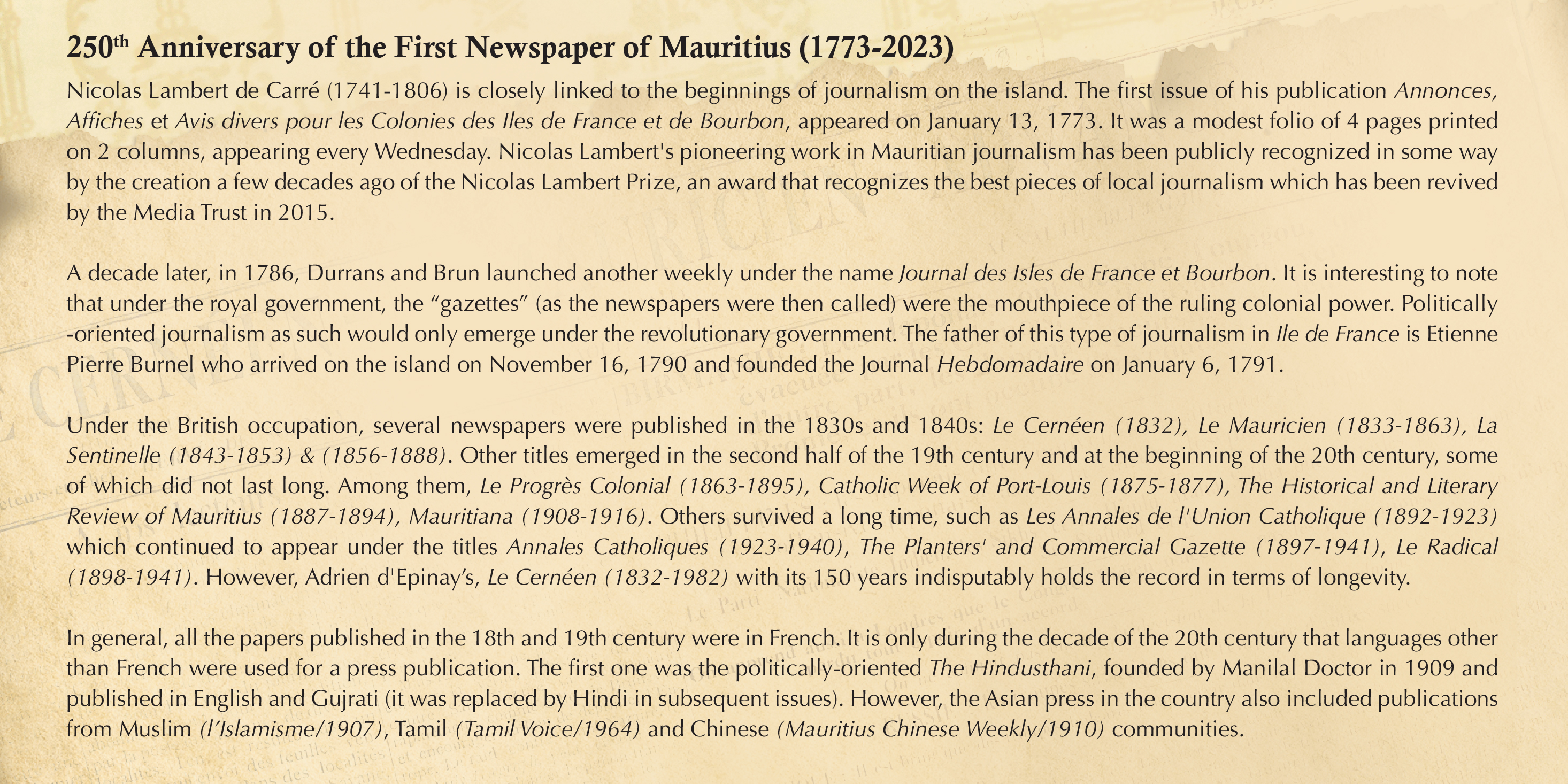 The inaugural issue of Annonces, Affiches et Avis divers pour les Colonies des Iles de France et de Bourbon was a modest folio consisting of only 4 pages printed on 2 columns, with a weekly publication schedule, appearing every Wednesday. Lambert’s dedication to disseminating information to the local community through the newspaper laid the foundation for the development of journalism in Mauritius.
