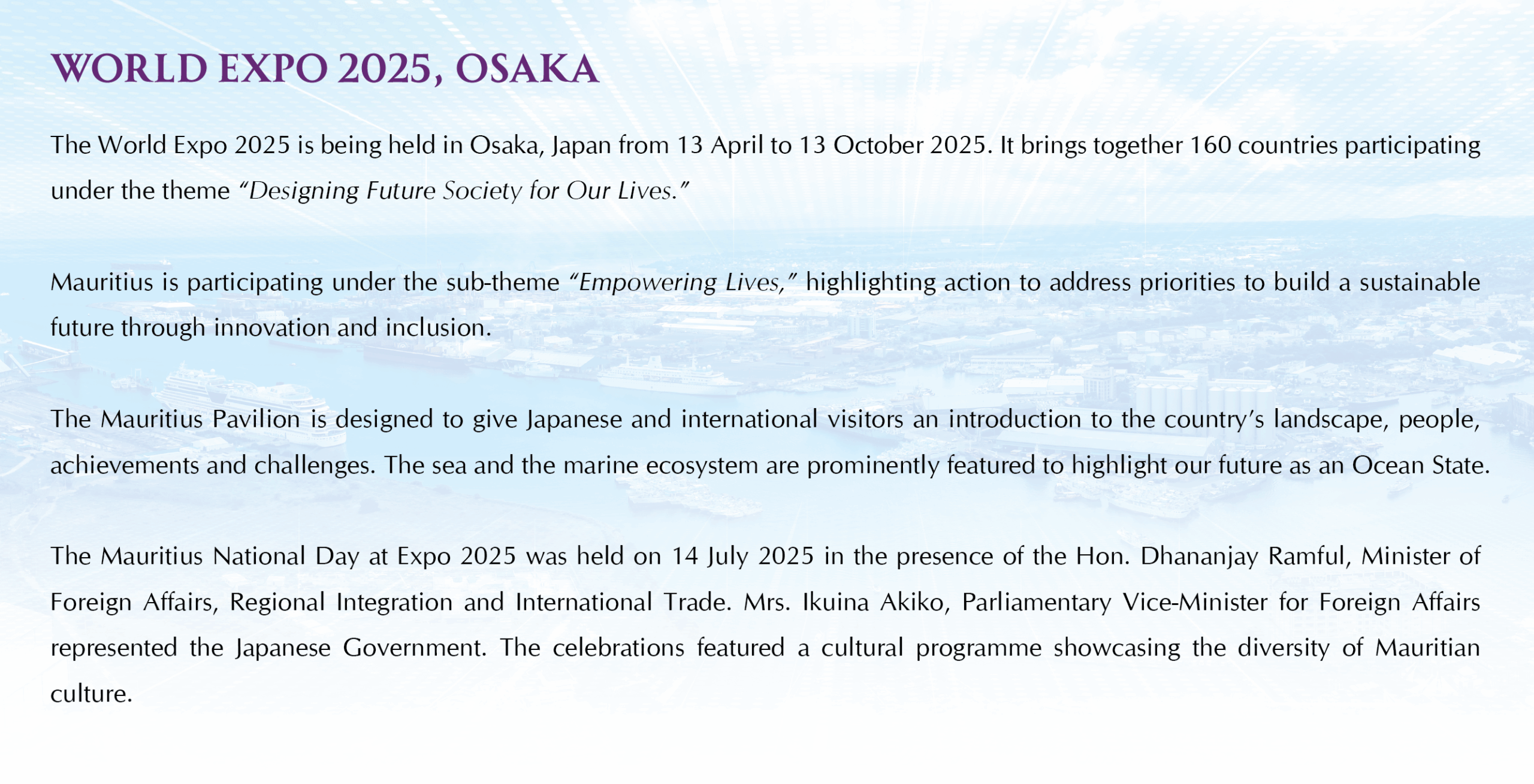 The Mauritius Pavilion is designed to give Japanese and international visitors an introduction to the country’s landscape, people, achievements and challenges. The sea and the marine ecosystem are prominently featured to highlight our future as an Ocean State. The Mauritius National Day at Expo 2025 was held on 14 July 2025 in the presence of the Hon. Dhananjay Ramful, Minister of Foreign Affairs, Regional Integration and International Trade. Mrs. Ikuina Akiko, Parliamentary Vice-Minister for Foreign Affairs represented the Japanese Government. The celebrations featured a cultural programme showcasing the diversity of Mauritian culture.